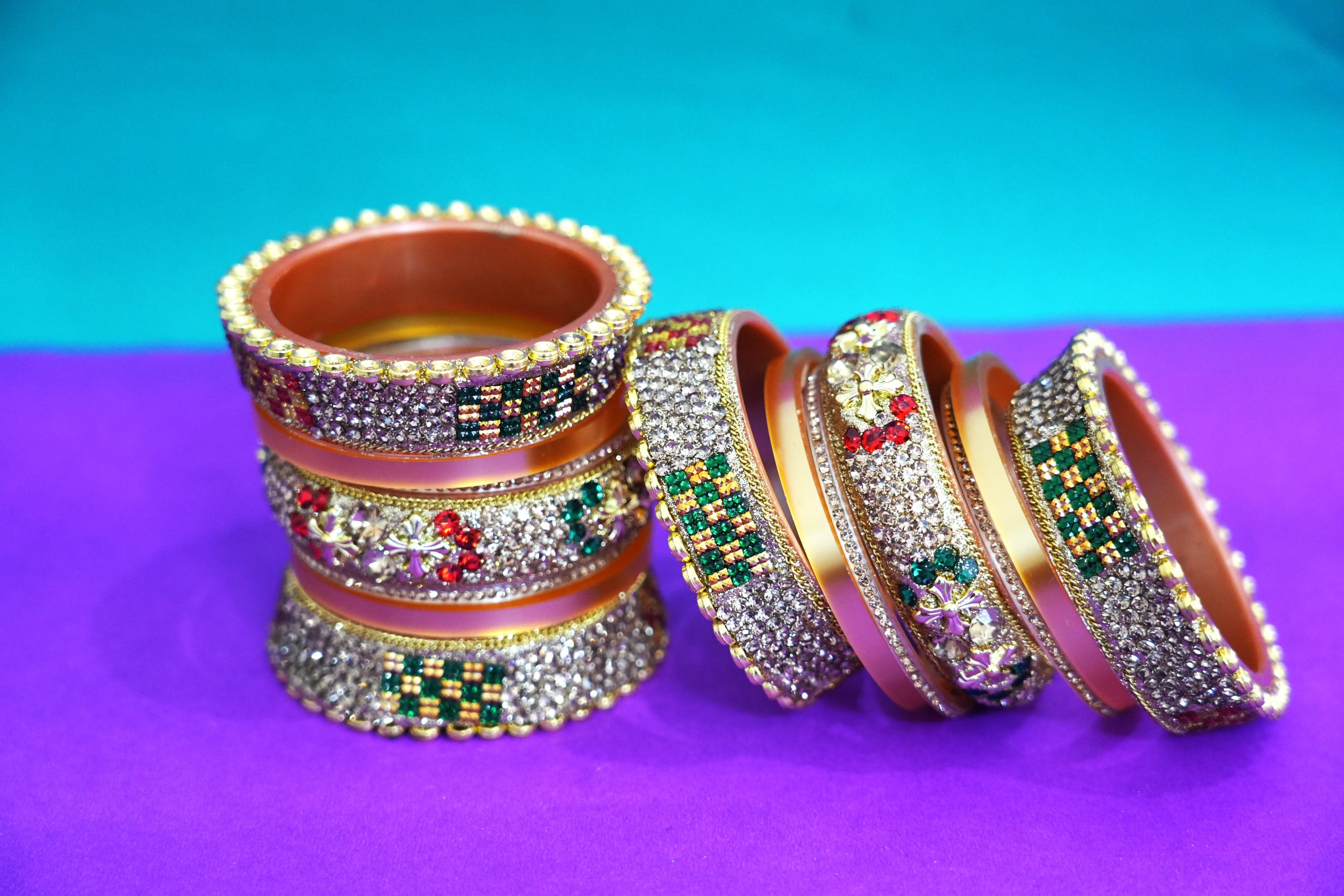 The bangles are adorned with sparkling crystals, floral kundan motifs, and colorful stone patterns, making them a standout accessory for weddings, receptions, Karwa Chauth, Teej, Gangaur, Diwali, and festive occasions.