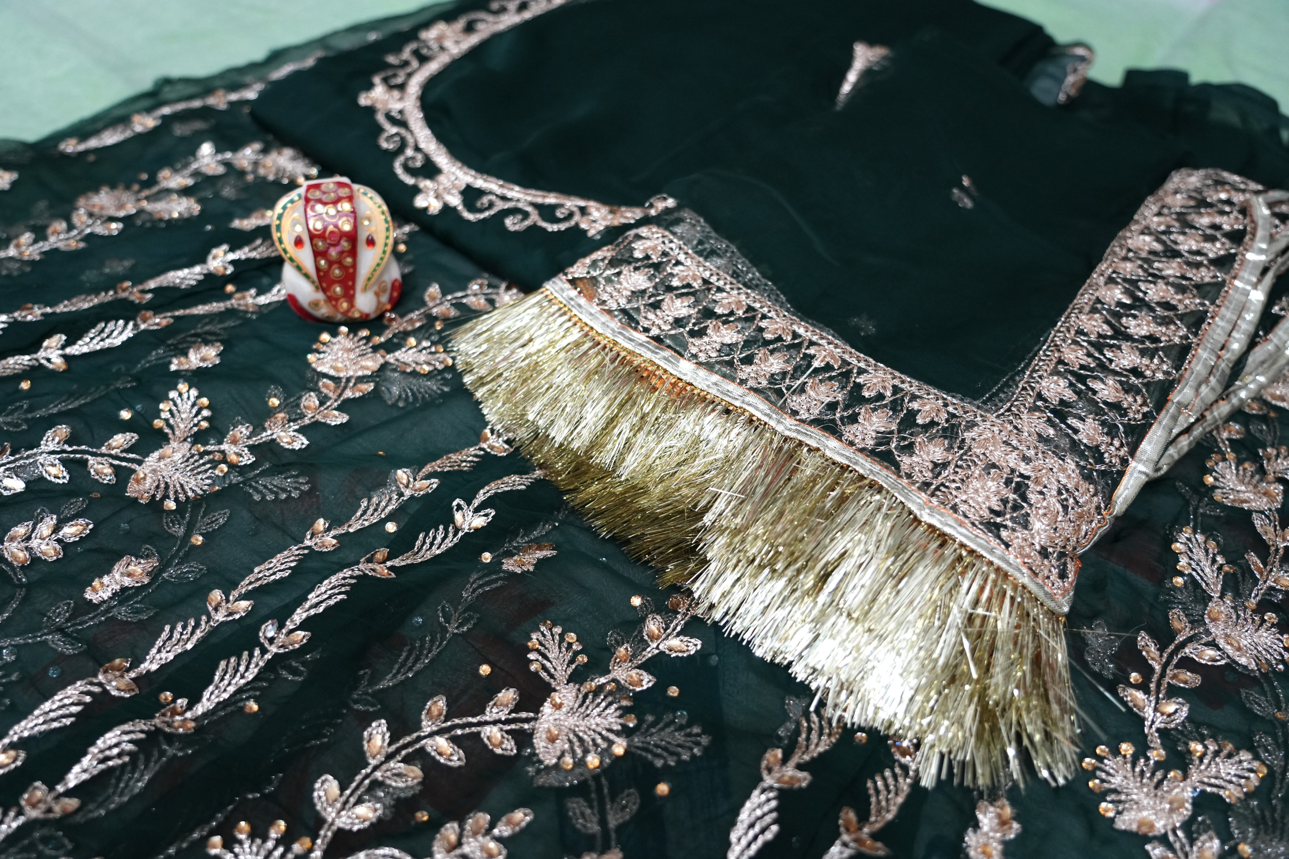 Dark Green poshak with Odhna Zari Work (Chapat) -