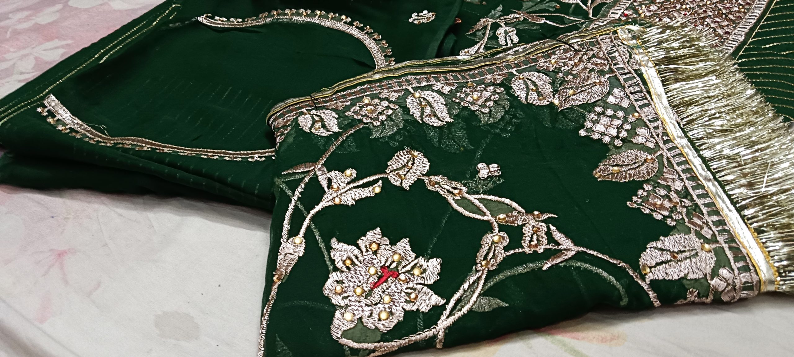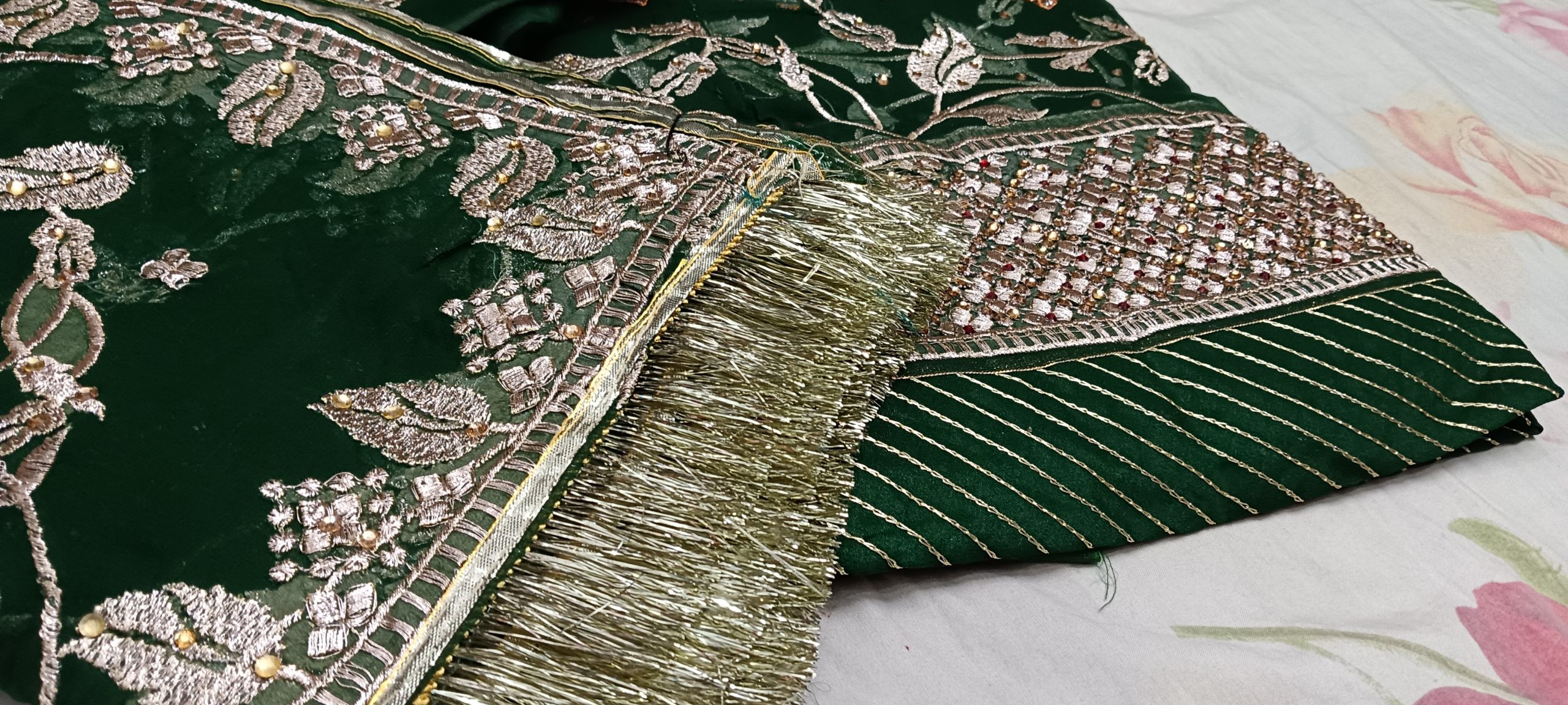 Royal Green Rajputi Poshak ekdum shahi look deti hai. Isme baniya embroidery aur royal green color aapko wedding, festival aur special occasions me classy aur graceful look dete hain. Ye poshak aapke traditional wardrobe ki shaan banegi.