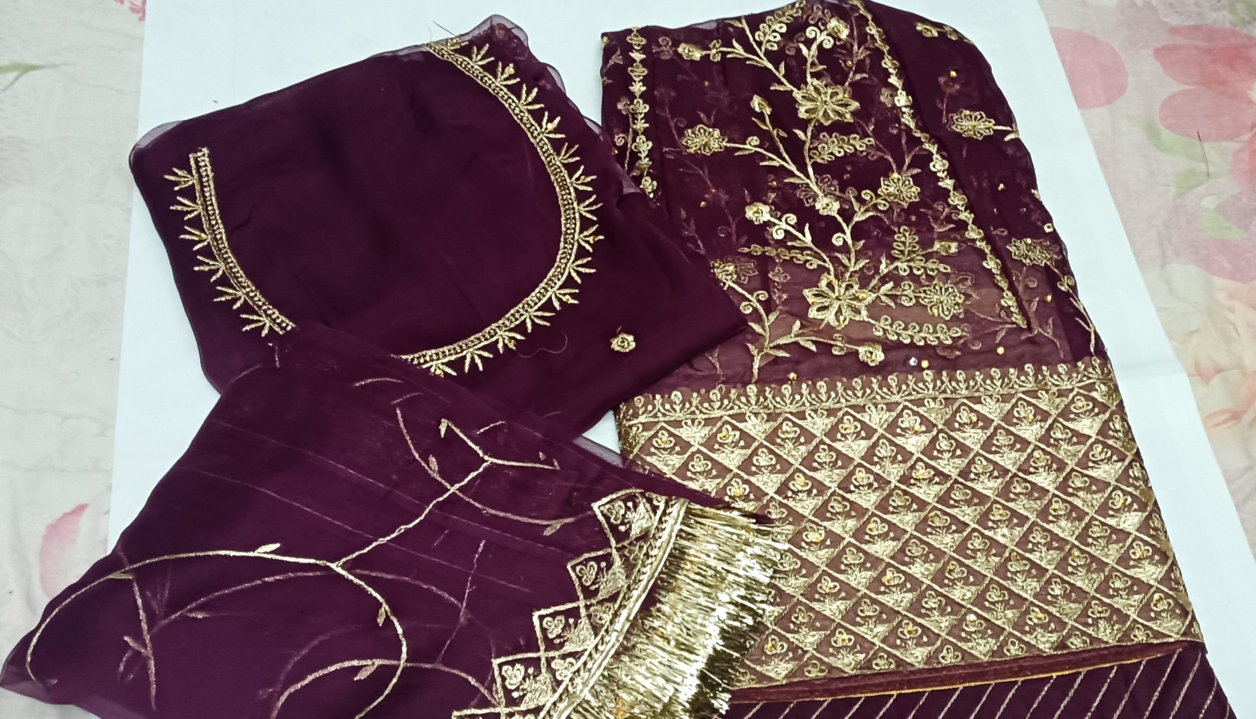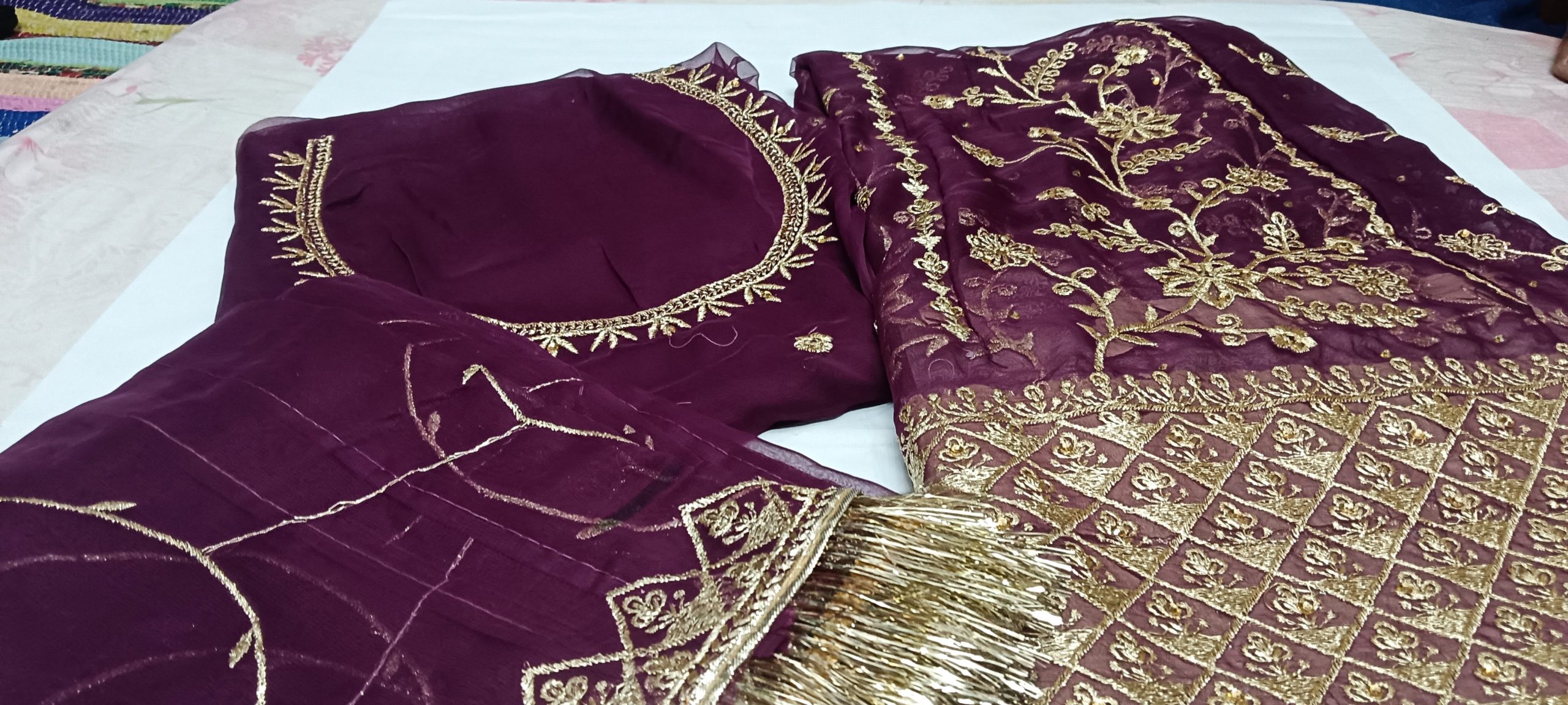 Wine Roshani Poshak ek rich aur royal attire hai jo har function ke liye ek unique choice banti hai. Winec olor apne aap me elegance aur sophistication lekar aata hai, jo aapko ek standout look deta hai. Premium soft fabric ka use ise lightweight aur comfortable banata hai, taaki aap ise easily carry kar saken. Is par ki gayi handcrafted detailing aur embroidery is poshak ko aur bhi khubsurat banati hai. Chahe family function ho, cultural event ya festive occasion, Purple Roshani Poshak aapki beauty ko aur enhance karegi aur aapko ek graceful aur stylish look degi.
